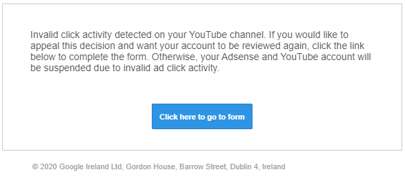 - “Invalid click activity detected on your YouTube channel.”